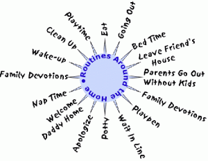 Wow – whoever wants to read about routines in this extraordinary month of December? [originally posted in Dec/08] Life with children can seem chaotic, at times even out of control. Establishing some basic routines can restore a sense of order that will make life easier for both parents and children. A routine doesn’t mean a rigid schedule; young children need structure with flexibility (especially in a holiday time period). For most families
